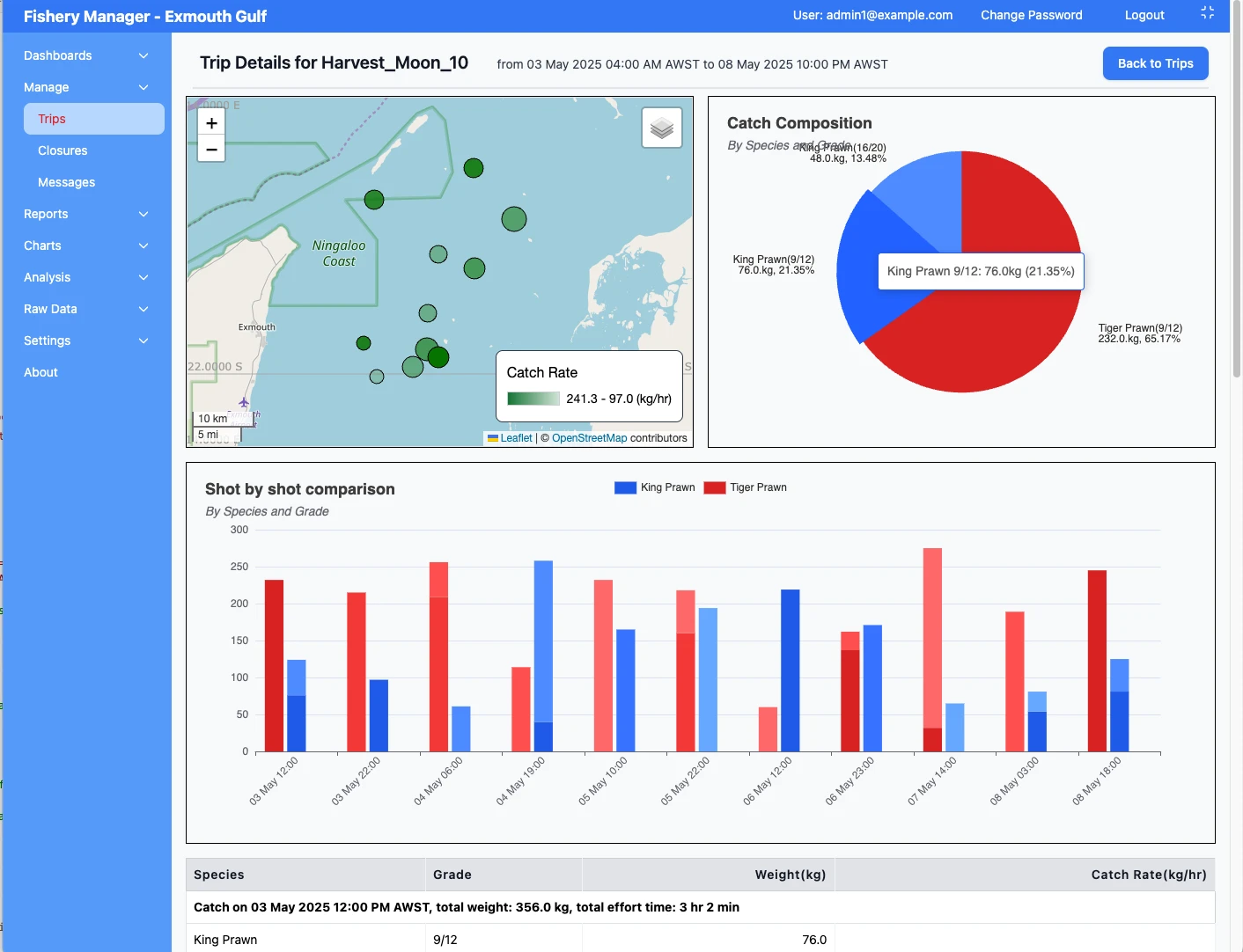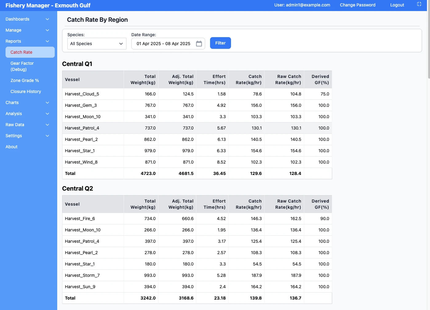 Many different charts, like catch summary total by region